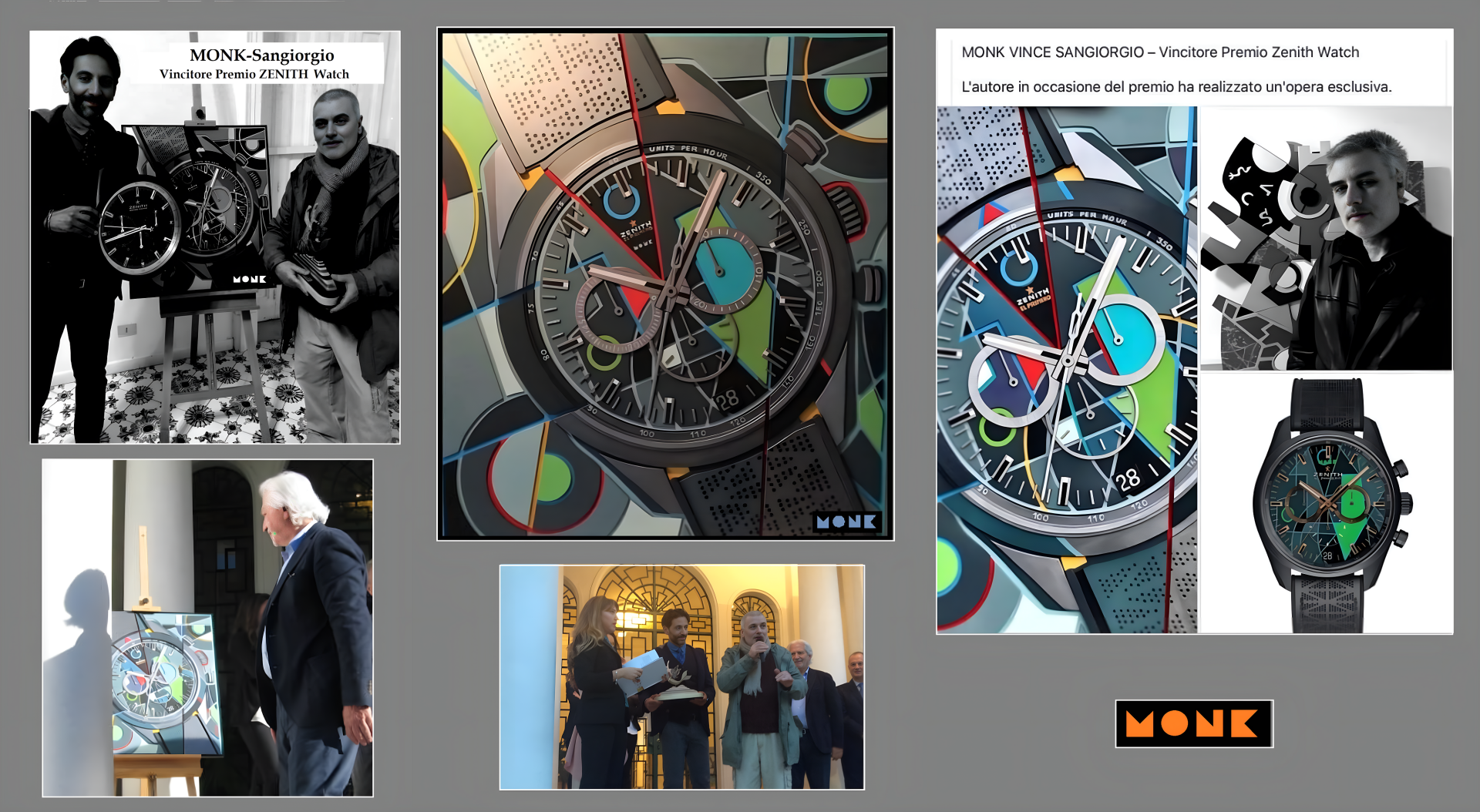 Nel percorso artistico di MONK-Sangiorgio, ogni creazione è un'espressione profonda e personale. Siamo onorati di aver ricevuto riconoscimenti che celebrano la nostra visione unica. Tra questi, spiccano il Premio Ford Transit Custom per un innovativo wrapping colorato in stile Monk e il Premio Zenith Watch, come miglior progetto decorativo per orologi. Questi premi non sono solo un attestato di merito, ma simboleggiano la nostra capacità di infondere arte nella vita di tutti i giorni, trasformando oggetti comuni in tele straordinarie. È un privilegio e un'immensa gioia vedere la nostra arte immersa nella realtà quotidiana.